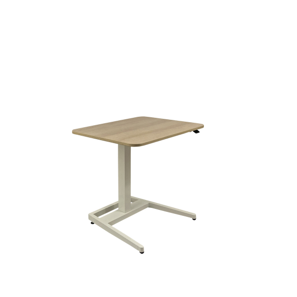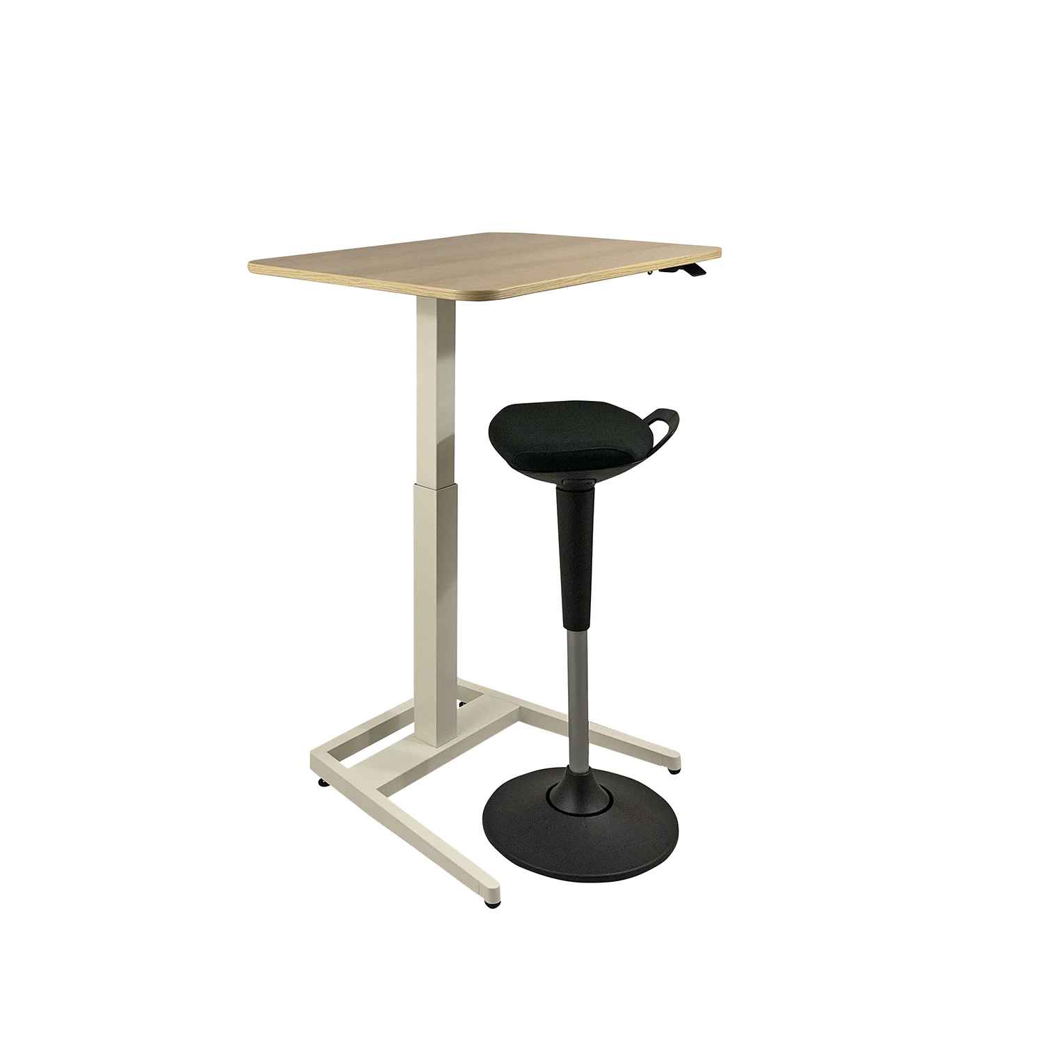 De voet is voorzien van 4 stelvoeten t.b.v. extra stabilisatie en 2 verzonken wieltjes voor snelle en eenvoudige verplaatsing van het meubel. De staande kolom is voorzien van een gasveer zodat snel en eenvoudig en zonder gebruik van elektriciteit het tafelblad op sta-hoogte gezet kan worden.